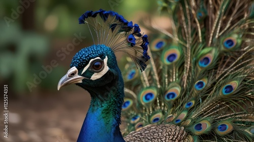 © titik, Fototapeta premium Close-up of a peacock's head and neck, showcasing vibrant blue and green feathers, eye, and beak.