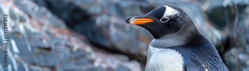 © Vodkaz, Naklejka premium Close-up of a penguin against a rocky backdrop