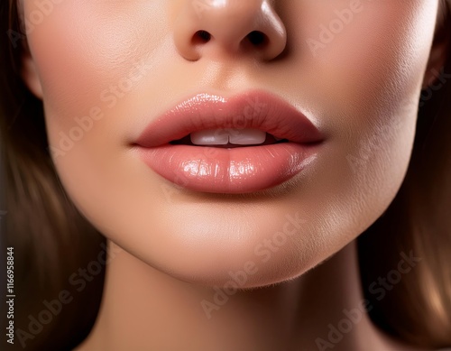 Fototapeta premium close-up of a perfect mouth with a subtle pout, showcasing the shape of the lips and the smooth skin, styled in a glamorous, beauty-oriented fashion with soft, diffused lighting