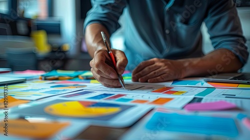 Fototapeta premium Close-up of a person analyzing business reports, charts, and graphs on a table, focusing on data and financial strategy in a modern office.
