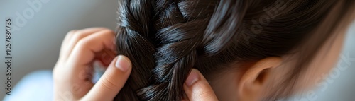 © Ytnart, Obraz premium Close-up of a person braiding hair, showcasing detailed technique and texture in an intimate setting.