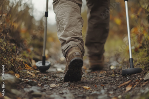 © Image Tree, Fototapeta premium Close-up of a person hiking on a forest path in the autumn season.