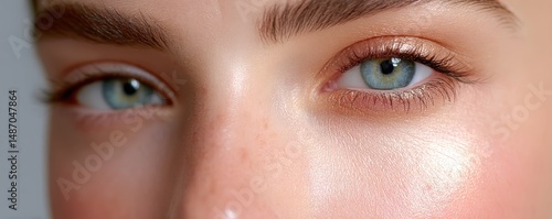 © narak0rn, Fototapeta premium Close-up of a person's blue-green eyes, well-groomed eyebrows, and glowing, healthy skin with a natural makeup look.