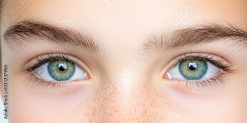 © missisya, Fototapeta premium Close Up of a Person s Blue Green Eyes with Eyebrows and Freckles