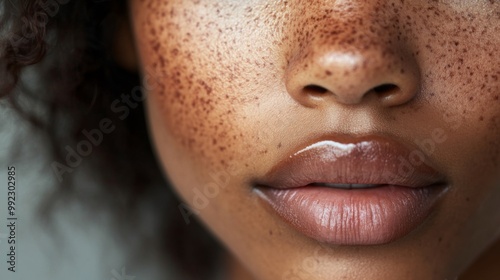 Fototapeta premium Close-up of a person's freckled face with their mouth slightly parted