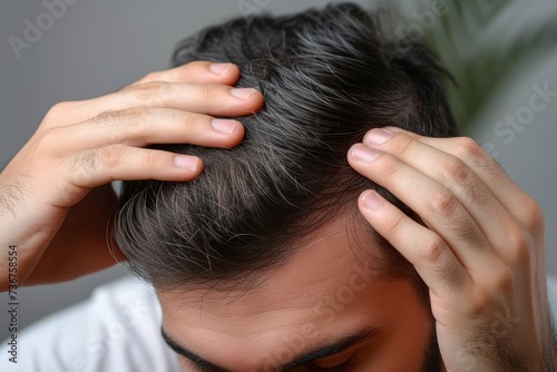 Fototapeta premium Close-up of a person's hand running through their hair, potentially checking...
