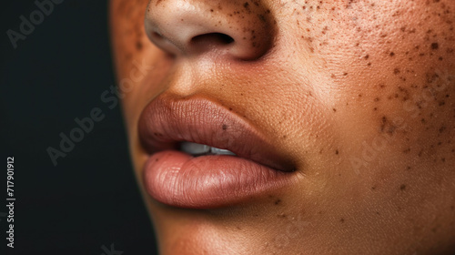 Fototapeta premium Close-Up of a Person's Lips with Freckles and Rich Complexion