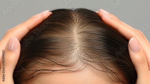Naklejka premium Close-up of a person's scalp, hands gently holding hair, showcasing healthy strands and a clean parting, Ideal for beauty, hair care, and wellness marketing materials,