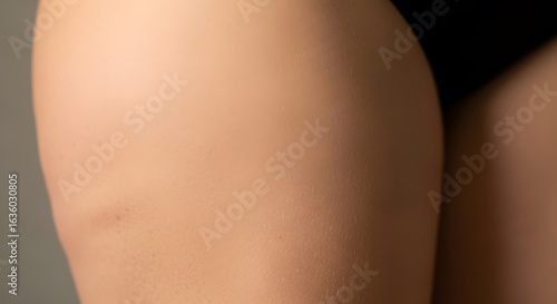 © Suwantono, Naklejka premium Close-up of a person's smooth, tanned skin on their thigh, highlighting its texture and tone
