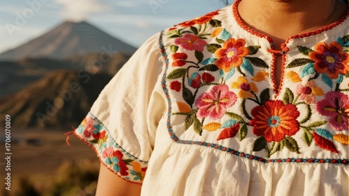 Obraz premium Close-up of a person wearing a traditional embroidered dress with floral patterns, set against a mountainous backdrop.