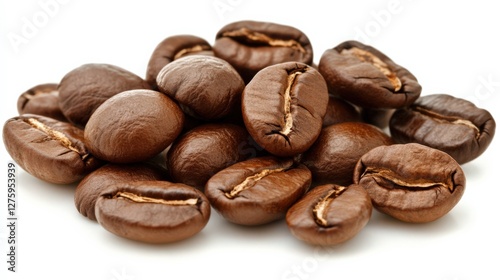 © Tyrah, Naklejka premium Close-up of a pile of roasted coffee beans showcasing rich textures and colors, perfect for beverage-related content
