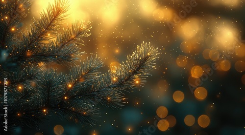 © Astri, Fototapeta premium Close-up of a pine branch with warm bokeh lights in the background.