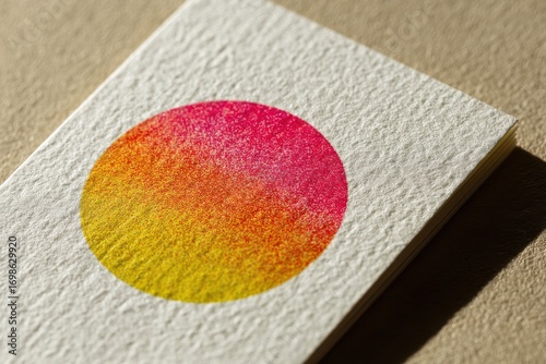 © Georgii, Obraz premium Close-up of a Pink and Yellow Gradient Circle on Textured Paper