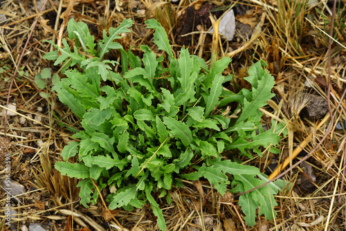 © Katerina, Fototapeta premium close up of a plant. wild arugula on a field of cut grass. eco farm. fragrant, spicy herb.