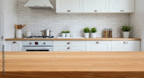© PP Creative, Fototapeta premium Close-up of a polished wooden kitchen counter in a bright modern kitchen