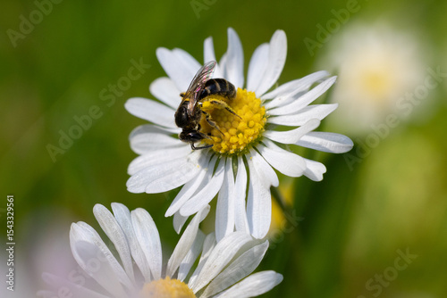 Fototapeta premium Close-up of a pollen-dusted bee pollinating a daisy