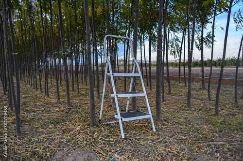 © Aaron Tamarit, Fototapeta premium close up of a portable staircase in the middle of a field on a cloudy day creative photo
