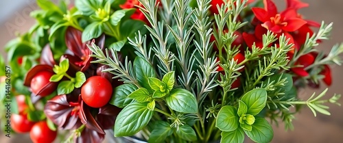 © KWY, Fototapeta premium close up of a potted plant with red flowers and green leaves