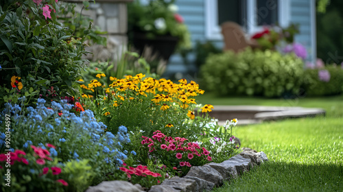 © Steve, Fototapeta premium Close-Up of a Pristine Landscaped Garden with Blossoming Flowers and Water Feature in Front of a Modern New Home.
