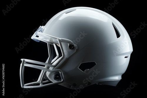 © Rifqi, Fototapeta premium Close-up of a pristine white football helmet with a clear visor against a stark black background. Concept for sports equipment advertising, team branding, and competitive athletic spirit