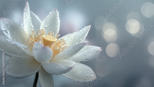 Fototapeta premium Close-up of a pristine white lotus flower with dew drops, soft focus background