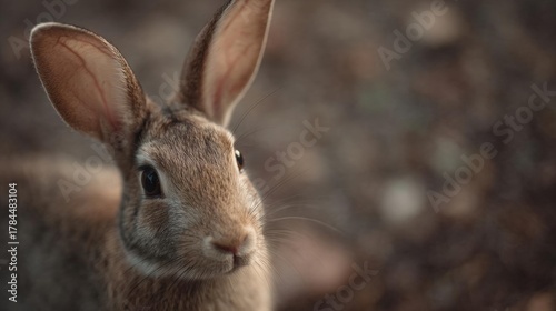 Fototapeta premium Close-up of a rabbit's face. the rabbit is facing towards the right side of the image, with its ears perked up and its eyes looking directly at the camera.