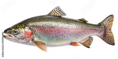 Naklejka premium Close up of a rainbow trout, cut out on a white background, fish, seafood, freshwater, vibrant colors, scales, fins, aquatic