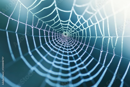 © Wed, Naklejka premium Close-up of a raindrop-covered spiderweb in a misty forest