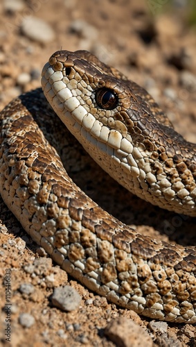 Fototapeta premium Close-up of a rattlesnake coiled in its desert habitat.