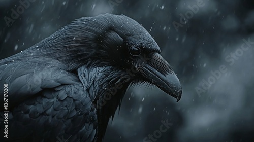 © BerkahStock, Naklejka premium Close-up of a raven in the rain.