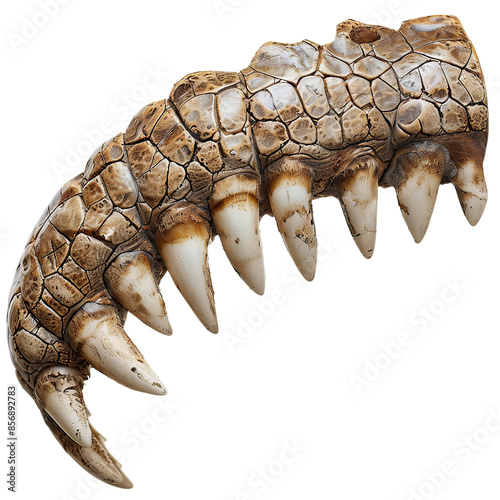 © Jenjira, Fototapeta premium Close-up of a realistic dinosaur claw fossil isolated on white background, showcasing intricate details of textures and structure.