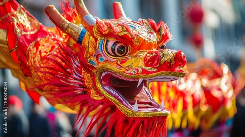 Fototapeta premium Close-up of a Red and Gold Dragon Costume Head