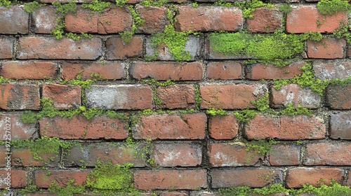 Obraz premium Close-up of a red brick wall with green moss growing on it.