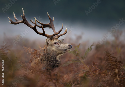 © giedriius, Fototapeta premium Close up of a red deer stag in the mist