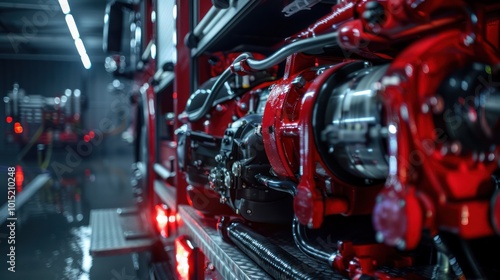 © Imsuniyah, Fototapeta premium Close-up of a Red Fire Truck Hose Reel and Engine Components