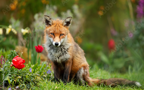 © giedriius, Naklejka premium Close up of a red fox against colorful background in spring