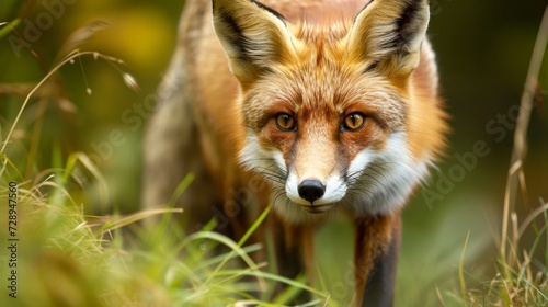 Fototapeta premium Close-up of a red fox hunting and stalking its prey, its keen eyes locked on the target, Ai Generated.
