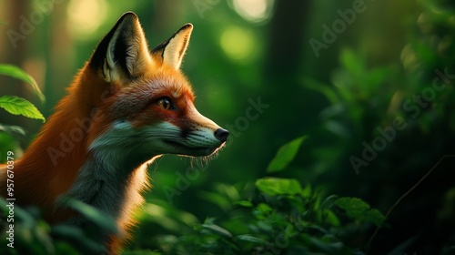 Fototapeta premium Close-up of a red fox in a lush green forest, highlighted by soft sunlight...