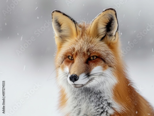 © Somi Danita, Fototapeta premium Close-up of a red fox in a snowy landscape. Isolated white background. Detailed fur. Winter scene. Natural wildlife photography. Serene atmosphere.