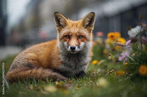 Obraz premium Close-up of a red fox resting on grass in a city environment
