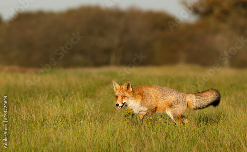 Fototapeta premium Close up of a Red fox walking in a grass field