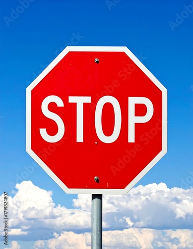 Obraz premium Close-up of a red, octagonal sign against a bright, cloudy sky