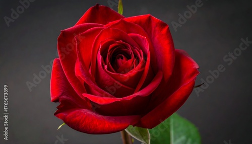 Fototapeta premium Close-up of a red rose in full bloom against a blurred, dark background. Focused petals show soft textures