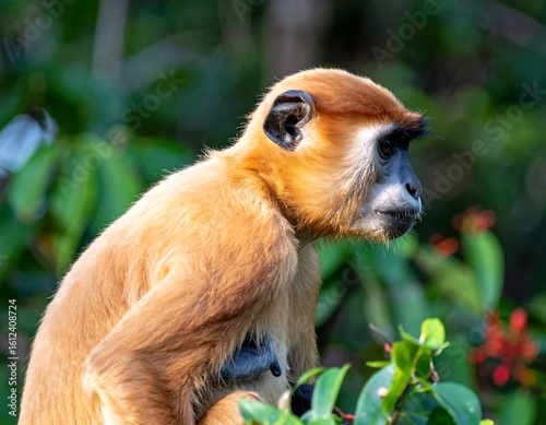 Fototapeta premium Close-up of a reddish-brown monkey in a jungle