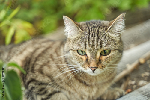 Fototapeta premium Close up of a relaxed tabby cat resting outdoors in lush greenery.