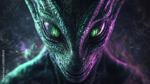 Fototapeta premium Close-up of a reptilian alien with glowing eyes against a cosmic backdrop.