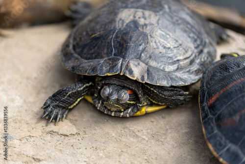 Fototapeta premium Close-up of a resting Red-eared Slider turtle on a rock