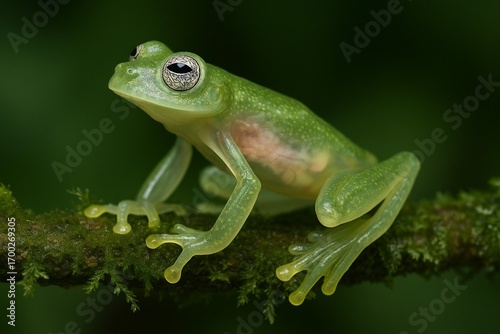 © なにがしあれこれ, Naklejka premium Close-up of a Reticulated Glass Frog (Hyalinobatrachium valerioi) on a mossy branch, showcasing its translucent skin and visible internal organs.