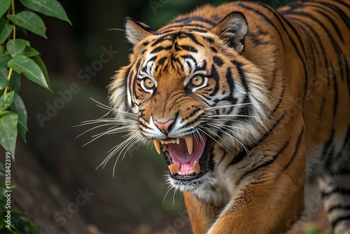 © Asikurrahaman, Fototapeta premium Close-up of a roaring Sumatran tiger with bared fangs and intense eyes