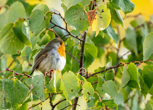 © Alexander, Fototapeta premium close up of a robin bird resting on a tree and chirping in fall